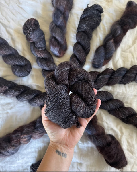 Slinky Singles (Fingering weight): 90% pure merino/10% linen, machine washable, 366m/100g.