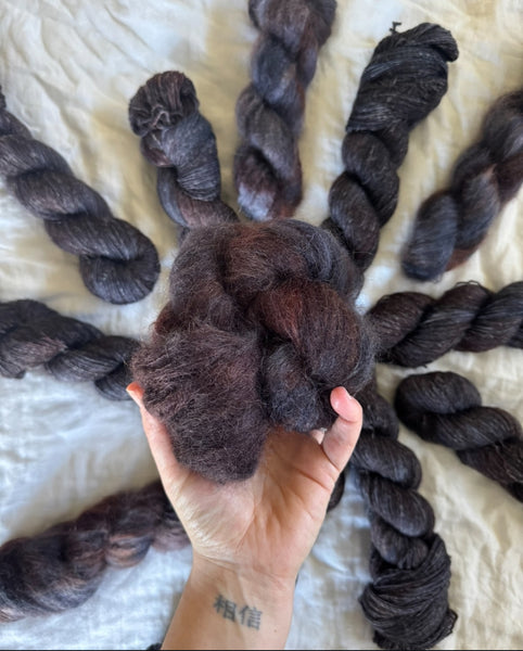 Majestic Mohair: (brushed singles/2ply lace weight): 72%mohair/28% silk, NON machine washable, 420m/50g.