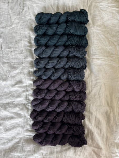 Super witchy and moody - this is a fade between Serpentine and The Silent Sisters, which are two of the tonals from the Faeries of the Faultlines yarns.